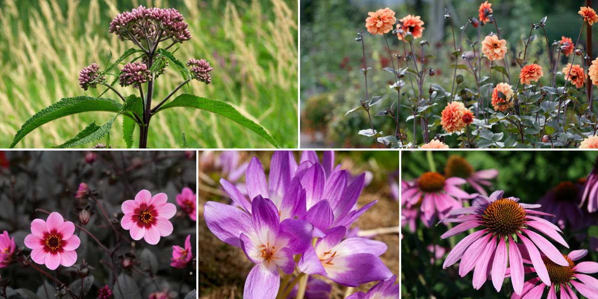 Une idée d’association avec les colchiques, pour une belle scène automnale. Eupatorium maculatum (photo D. Gordon E. Robertson), Dahlia ‘David Howard’ (photo Leontine Trijber – iBulb), Dahlia ‘Happy Single Wink’, Colchicum ‘Lilac Wonder’ (photo Wouter Koppen – iBulb) et Echinacea purpurea (photo Daniel Schwen)