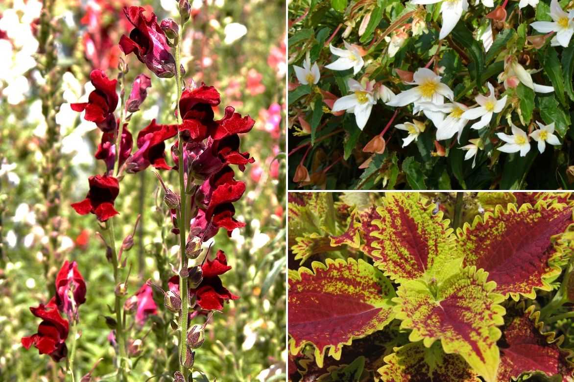 Une idée d’association en pot : Antirrhinum majus ‘Black Prince’, Begonia Summerwings ‘White Elegance’ et Coleus ‘Skyfire’