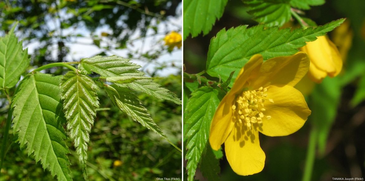 De gauche à droite : feuillage léger et finement denté / fleur simple d’un Kerria japonica ‘Golden Guinea’.