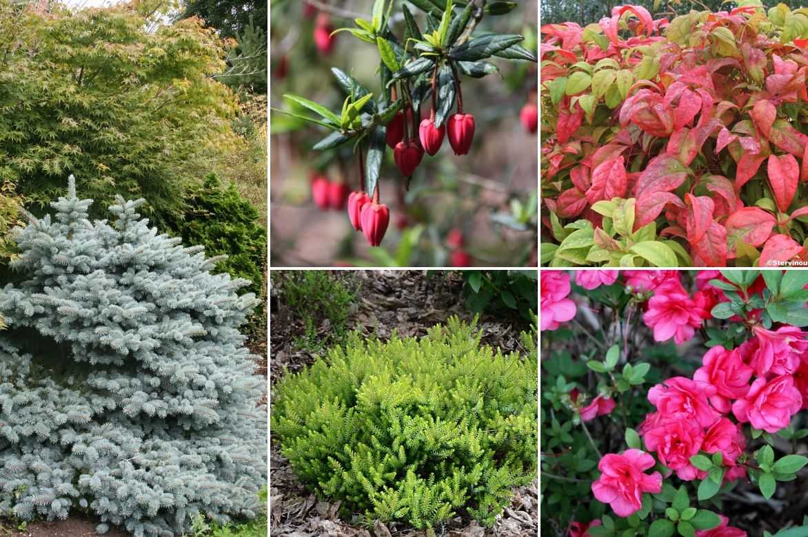 Un exemple d’association 4 saisons : un Erable du Japon et un Picea pungens ‘Glauca Globosa’, un Crinodendron hookerianum, quelques Nandina domestica ‘Firepower’, des Erica ‘Winter Belles Tylou’ (et/ou d’autres bruyères d’hiver) en couvre-sol et une Azalée du Japon ‘Christina’