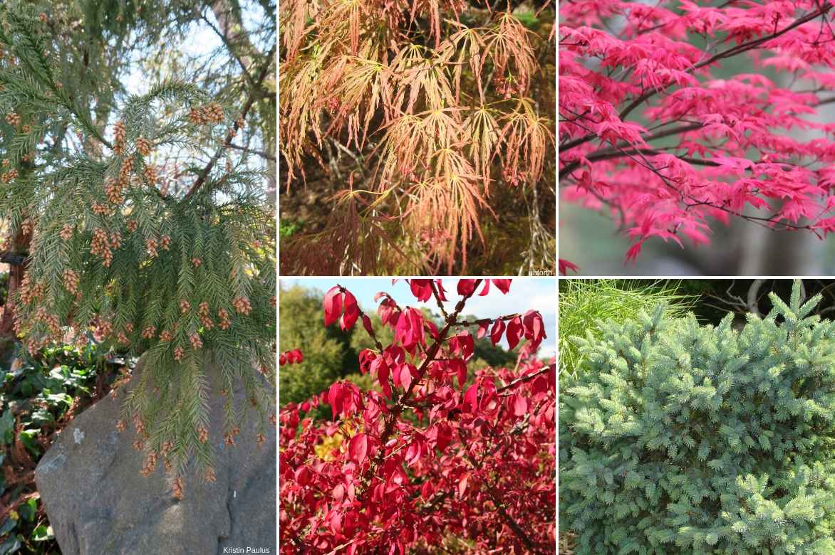 Une idée d’association automnale : Cryptomeria japonica ‘Sekkan Sugi’, Acer palmatum ‘Dissectum’, Acer palmatum ‘Shindeshojo’, Euonymus alatus et Picea glauca Cecilia’