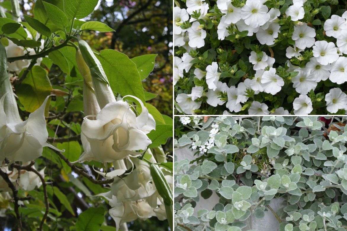 Un exemple d’association dans un grand pot au soleil : Brugmansia arborea, Petunia Surfinia ‘Snow’ et Helichrysum petiolare à son pied