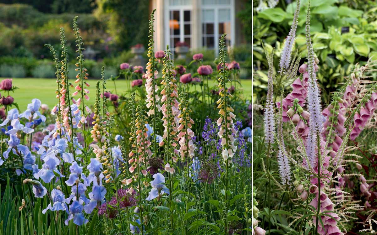 Une association avec Digitalis ‘Suttons Apricot’, Iris ‘Jane Phillips’ et Papaver orientale ‘Patty’s Plum’ (photo Clive Nichols – MAP) / Digitale mertonensis, Veronicastrum et Aruncus aethusifolius ‘Horatio’