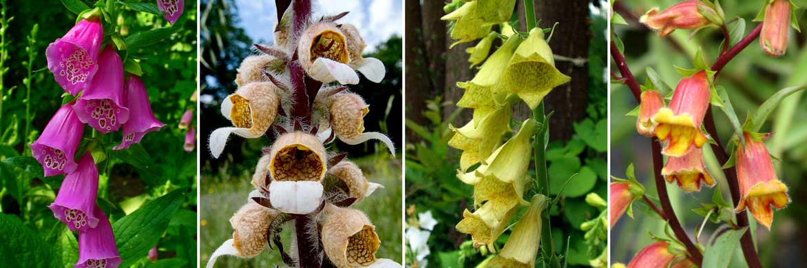 Les différentes floraisons des digitales ! Digitalis purpurea (photo H. Zell), Digitalis lanata (photo Katya), Digitalis_grandiflora (photo Orchi) et Digitalis obscura (photo Peganum)