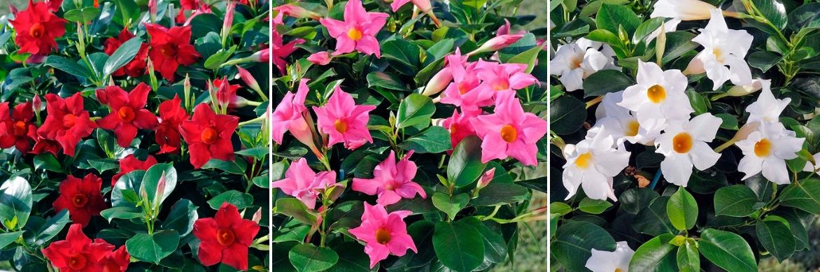 Quelques fleurs de Dipladenia : D. Diamantina Jade Scarlet , D. Diamantina Jade Pink et D. Diamantina Jade White