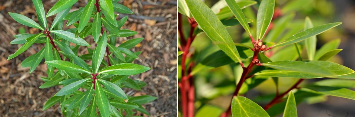 - Les rameaux rouges du Drimys aromatica créent un joli contraste avec le vert de ses feuilles