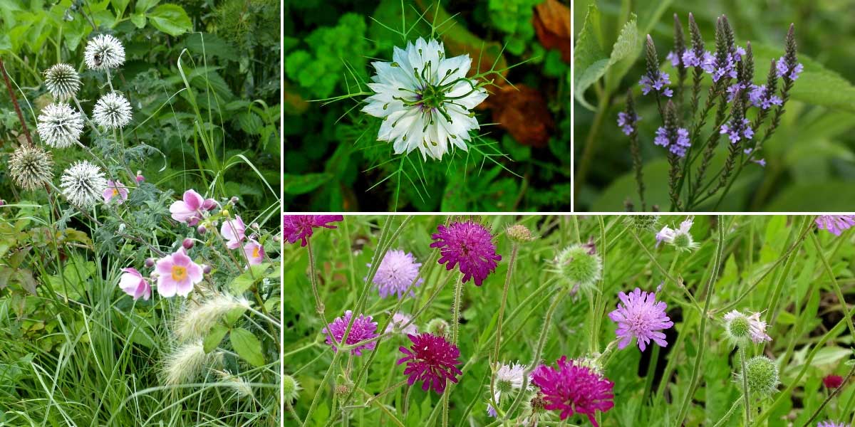 Parce qu’ils ont un aspect léger, aéré, sauvage, les échinops peuvent tout à fait s’intégrer dans les jardins naturalistes. Plantez-les aux côtés des superbes verveines hastées (Verbena hastata), sanguisorbes, agastaches, knauties… D’autant plus que les échinops sont de bonnes plantes mellifères. Profitez-en pour aménager un jardin favorable à la biodiversité. Vous pouvez aussi y intégrer la nigelle de Damas et ses superbes fleurs bleues, très délicates.