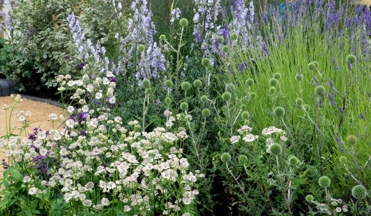 Une idée d’association avec Echinops sphaerocephalus, Astrantia major, Aconitum ‘Stainless Steel’ et Lavande (photo Nicole et Patrick Mioulane – MAP)