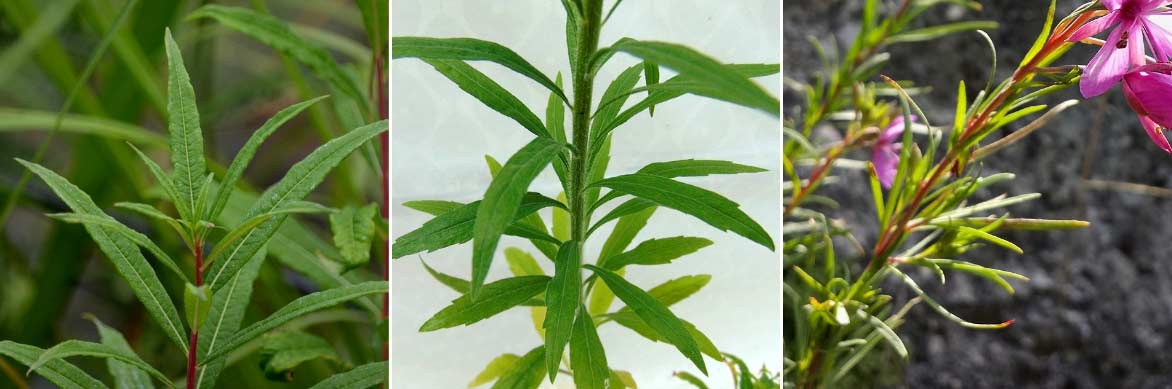 Le feuillage de la variété ‘Stahl Rose’ et celui de l’Epilobium angustifolium ‘Album’ / Les feuilles de l’Epilobium fleischeri, bien plus fines (photo Hectonichus)