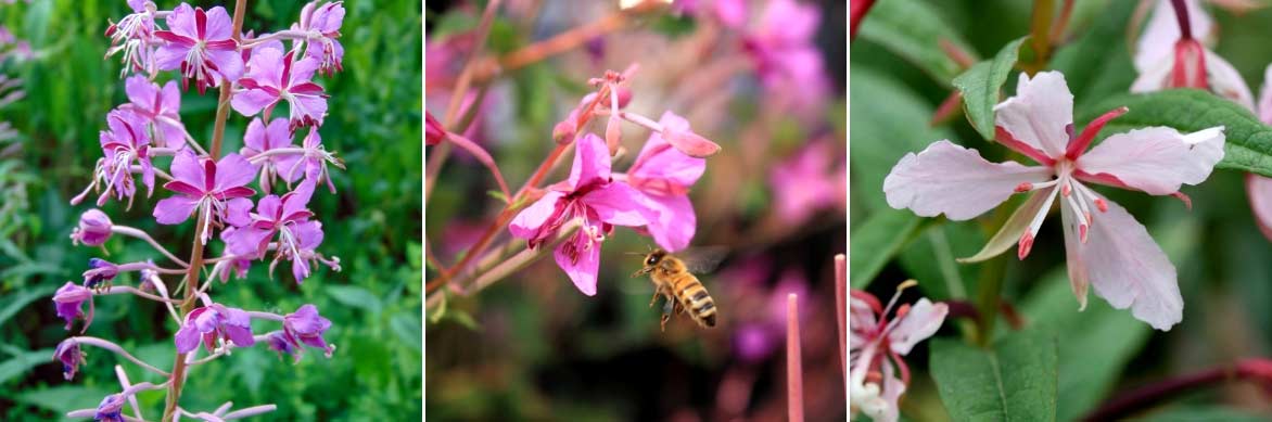 Une inflorescence d’Epilobium angustifolium / La pollinisation d’un épilobe (photo Rüdiger Stehn) / Détail d’une fleur d’Epilobium angustifolium ‘Stahl Rose’ (photo V. Elayne)