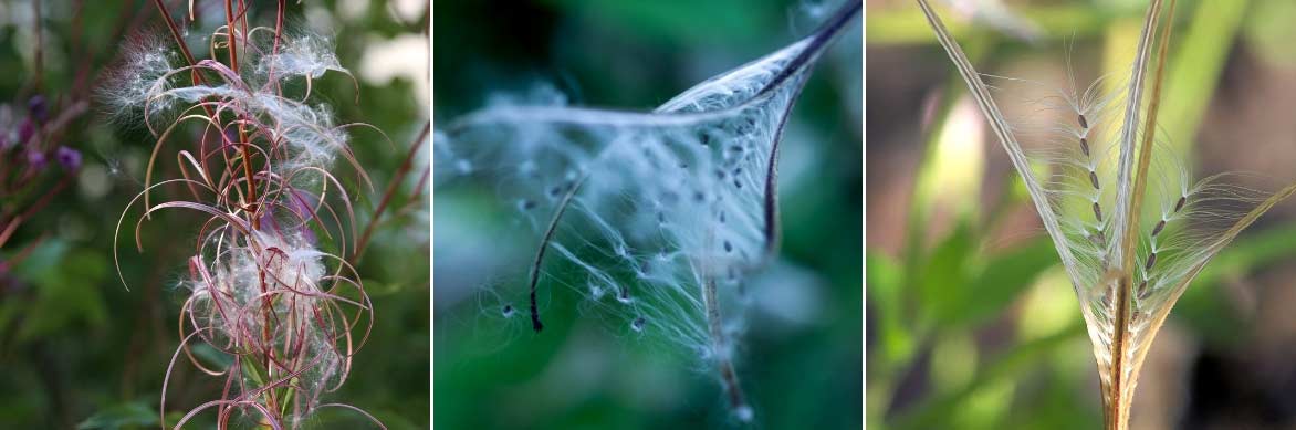 Les fruits et graines des épilobes sont très décoratifs ! Dans l’ordre, les espèces Epilobium angustifolium (photo Dcrjsr), Epilobium hirsutum (photo Colin) et Epilobium tetragonum (photo Rasbak)
