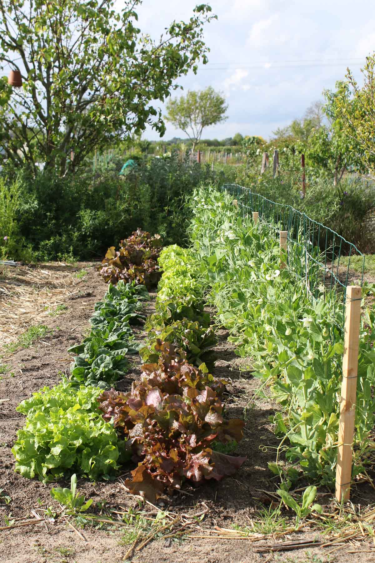 Une de mes plates-bandes printanière dans laquelle l’épinard pousse harmonieusement avec diverses variétés de laitues à couper. Idéal pour des mescluns riches en couleurs et en texture en ajoutant quelques pois croquants (à droite).