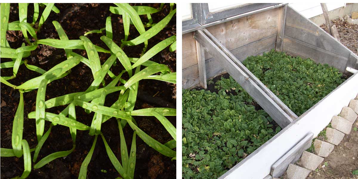 1) Levée de plantules d’épinards semés à la volée. 2) Culture sous châssis