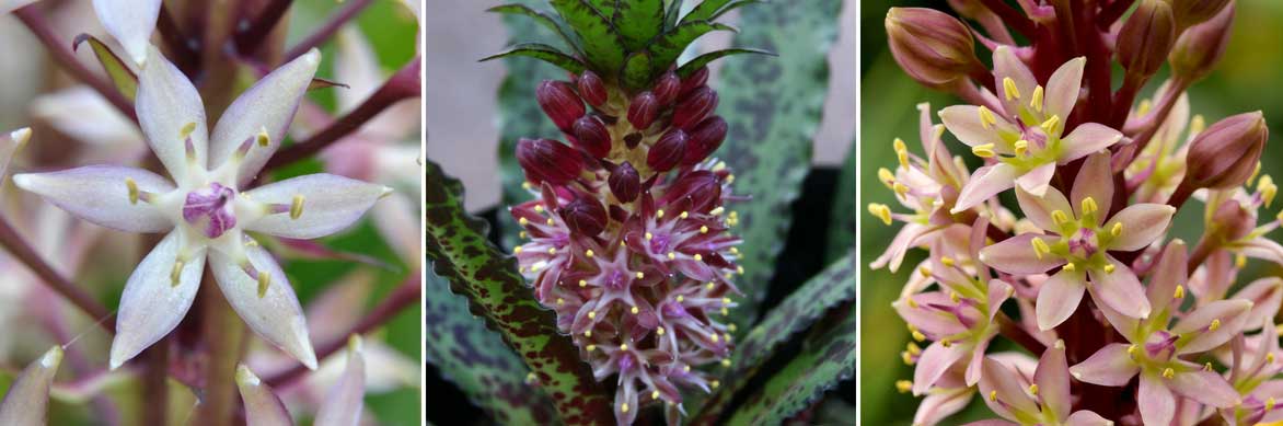 La floraison des eucomis ! De gauche à droite, Eucomis comosa (photo Jean-Michel Moullec), Eucomis vandermerwei, et Eucomis ‘Sparkling Rosy’ (photo Wouter Koppen – iBulb)