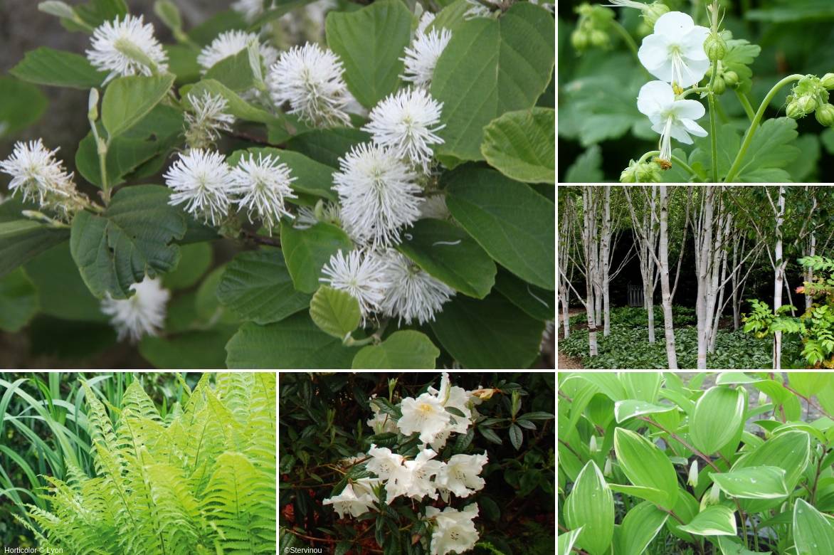 Une idée d’association en sous-bois clair et terre acide : Fothergilla major, Geranium macrorrhizum ‘White Ness’, Polygonatum falcatum ‘Variegatum’, Rhododendron fragrantissimum, Matteuccia struthiopteris sous le couvert de Betula utilis var. jacquemontii