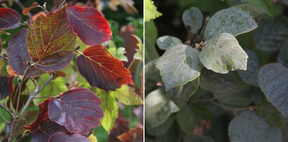 Feuillage d’automne du Fothergilla gardenii et feuillage bleu acier du Fothergilla intermedia ‘Blue Shadow’