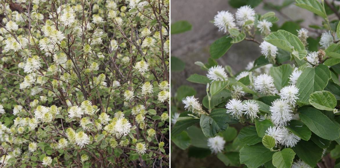 On ne trouve que deux espèces de Fothergilla : le Fothergilla major (haut jusqu’à 2,5 m) ou “grand Fothergilla” qui fleurit en mai-juin et le Fothergilla gardenii, une sorte de fothergilla miniature à la floraison plus précoce (mars-avril ou mai selon le climat) et qui avec sa petite taille (1m) s’installe dans tous les jardins.
