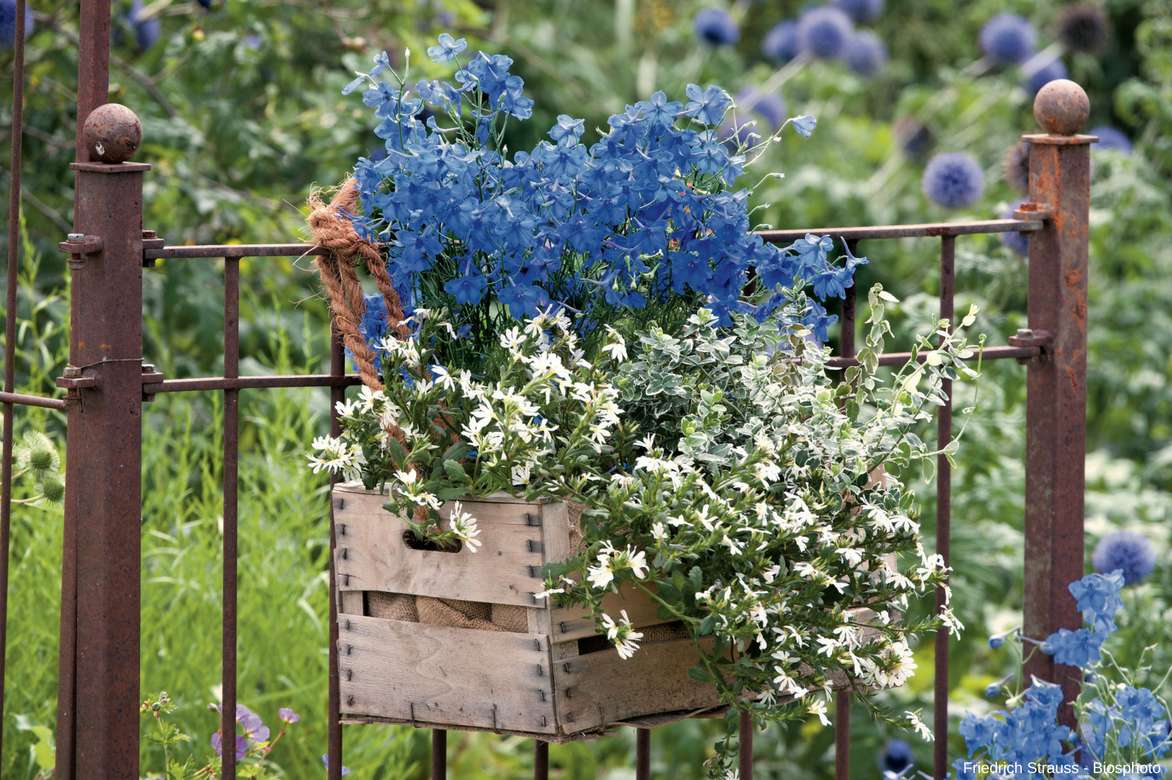 Les petits fusains persistants se prêtent bien à la culture hors sol, ici : Euonymus fortunei ‘Emerald Gaiety’, Delphinium ‘Blue Diamonds’, Scaevola ‘White Blessing’.