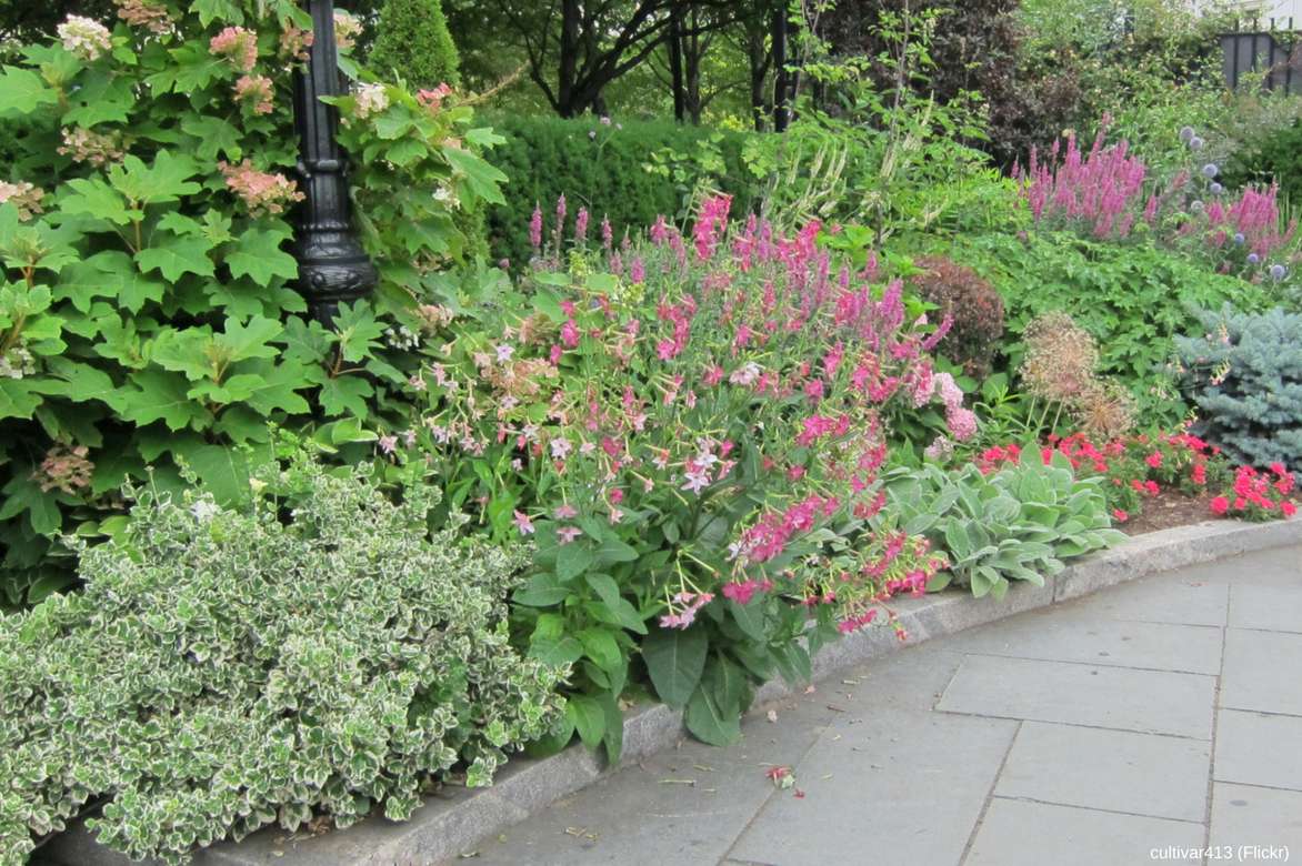 Un exemple d’association : Euonymus fortunei ‘Emerald Gaiety’, Nicotiana alata, Lythrum salicaria, Stachys byzantina, Hydrangea quercifolia ‘Snow Queen’.