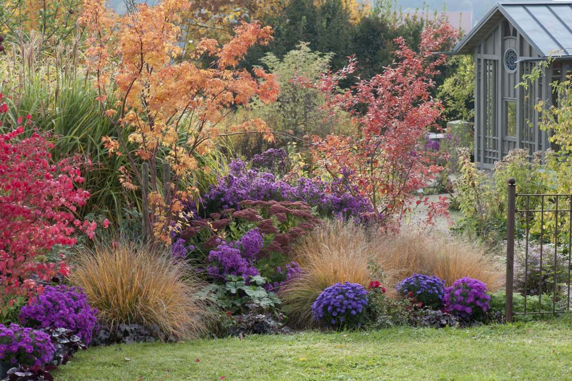 Un exemple d’association automnale : Euonymus alatus, Acer palmatum, Pennisetum alocuperoïdes ‘Hameln’, Miscanthus sinensis ‘Malepartus’, Sedum ‘Autumn Joy’, Heuchères et divers Asters. (Friedrich Strauss – Biosphoto)