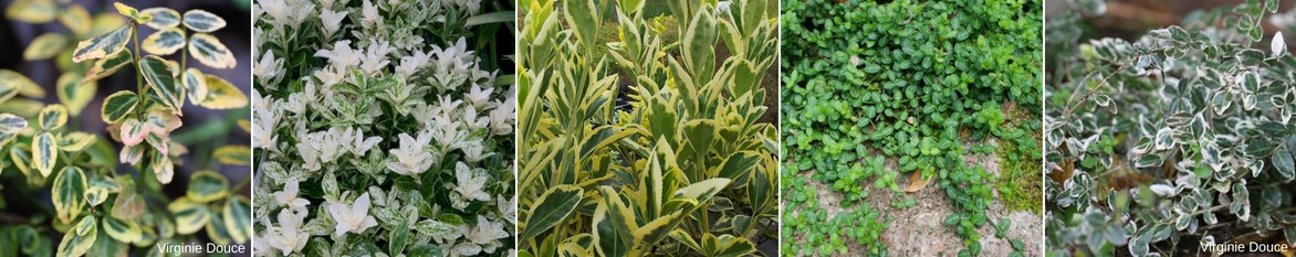 Quelques fusains à feuillage persistant et décoratif : Euonymus fortunei ‘Emerald ‘n Gold’, Euonymus japonicus ‘Pierrolino’, Euonymus japonicus ‘Bravo’, Euonymus fortunei ‘Minimus’, Euonymus fortunei ‘Emerald Gaiety’.