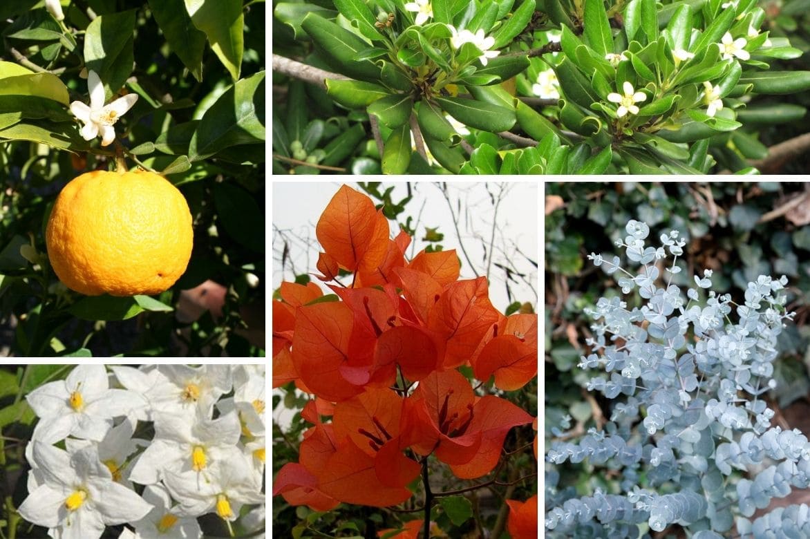 Sur une terrasse, le grenadier à fruits peut être associé à un Citrus sinensis, un Solanum, un Pittosporum, un Bougainvillier et un Eucalyptus