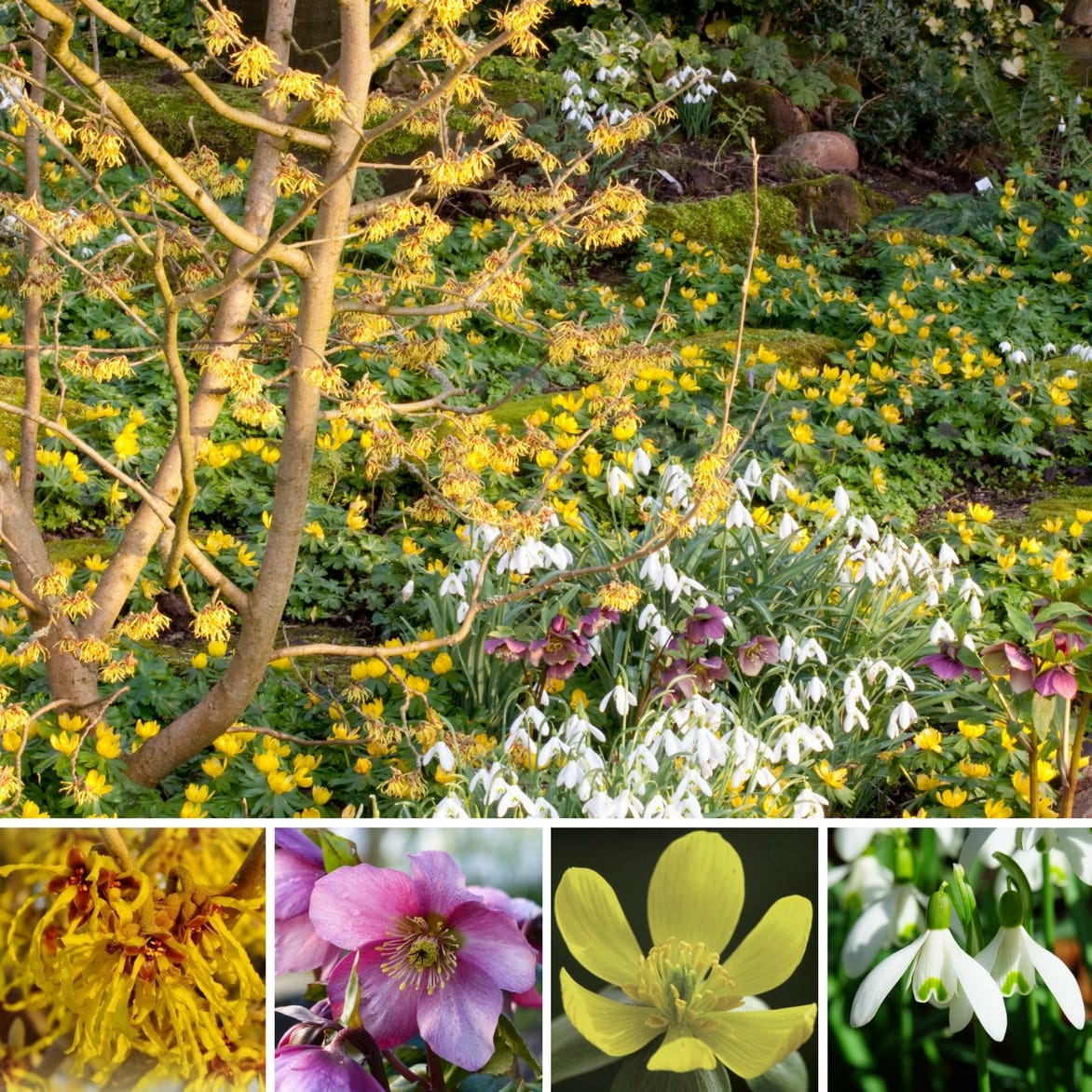 - Hamamélis japonica : sous nos latitudes, cet arbuste au port épanoui ne dépassera pas 3 à 4 mètres de haut. Ses fleurs parfumées, jaune clair, à pétales tire-bouchonnés s’épanouissent en très grand nombre, de janvier à mars. Ses feuilles ovales virent au jaune en automne. ‘Zuccariniana’ porte une abondance de petites fleurs jaune citron pâle et dégagent un parfum citronné. Elles apparaissent tardivement en février-mars. ‘Sulphurea’ s’illustre par sa une profusion de fleurs jaune soufre pâle, de janvier à fin février.
