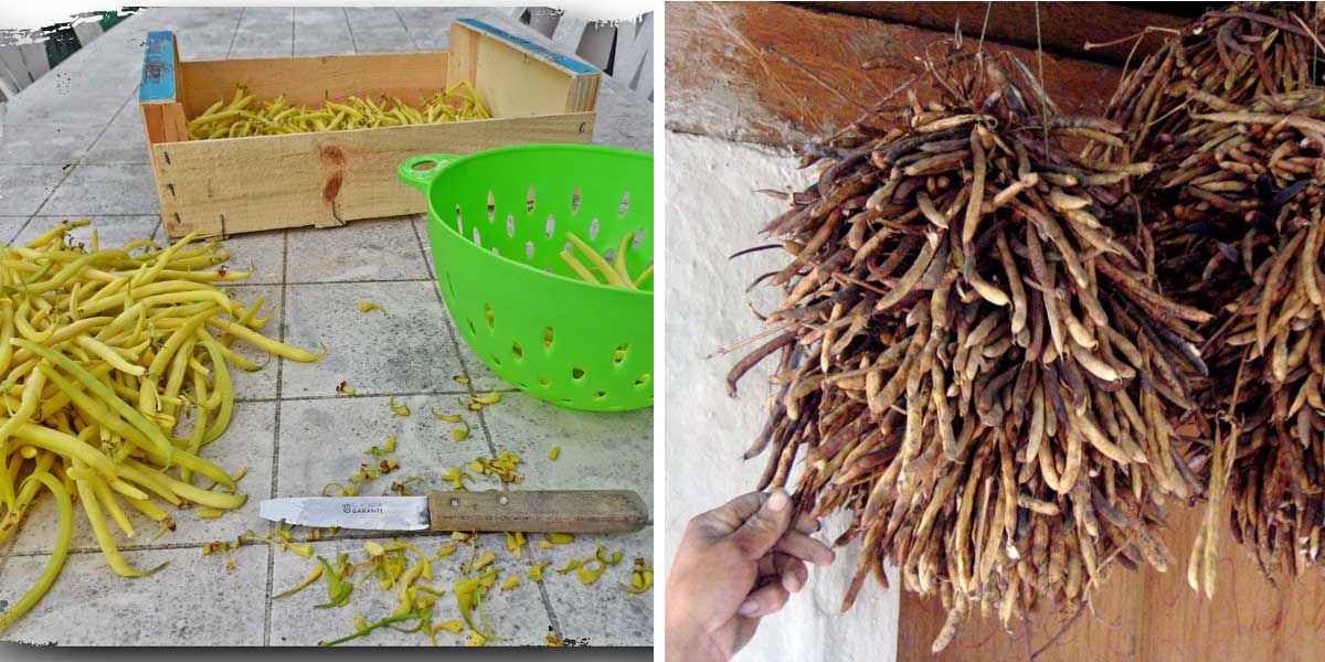 Les haricots verts demandent à être équeutés avant d’être consommés ou surgelés. Des gousses de haricots mises à sécher pour récolter des grains secs.