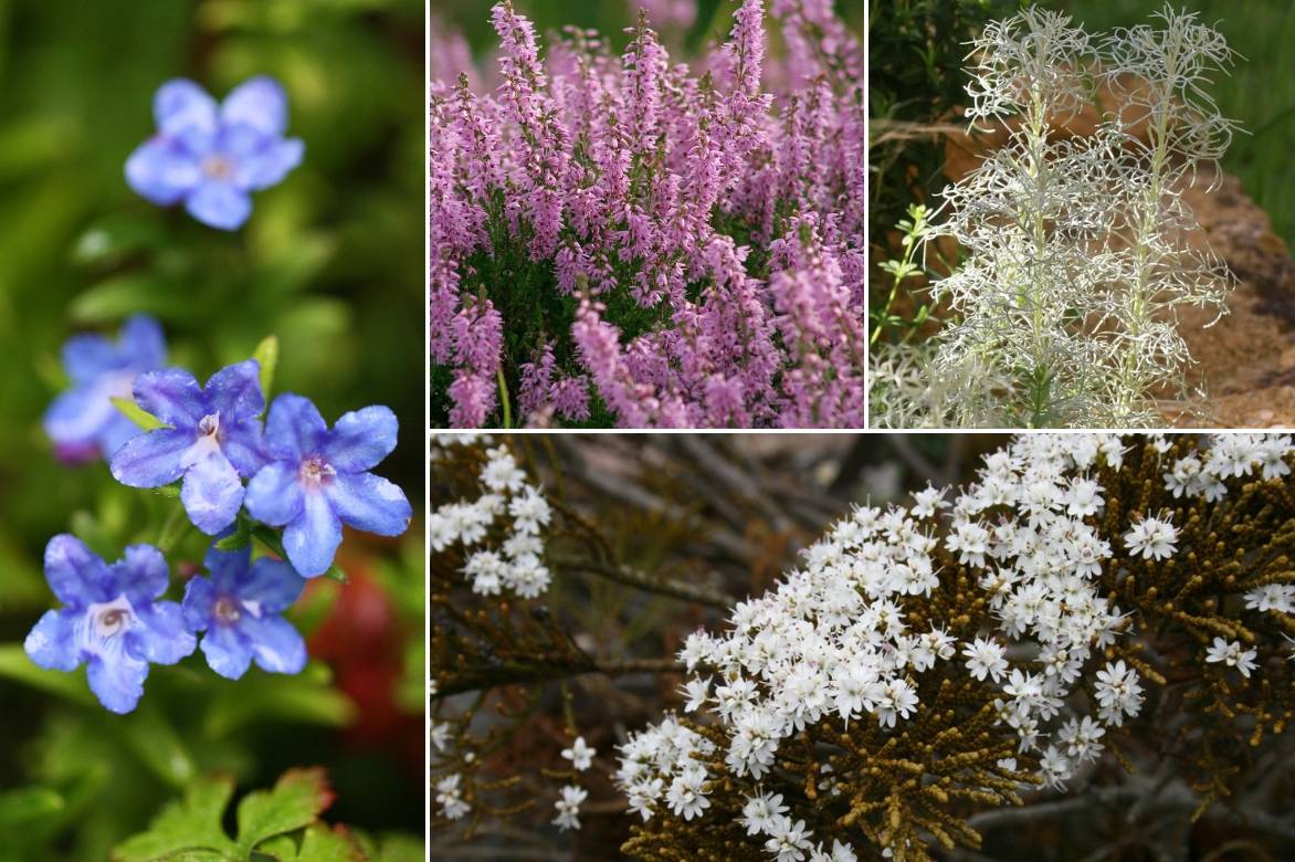 Un exemple d’association : Lithodora diffusa ‘Heavenly Blue’, Calluna vulgaris ‘H.E Beale’, Artemisia alba ‘Canescens’, Hebe ochracea