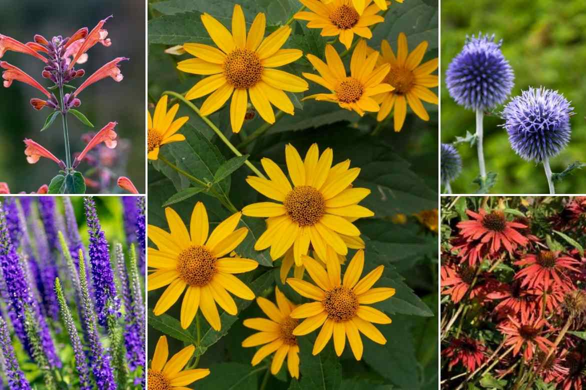 L’Heliopsis aux couleurs chaudes se marie très bien avec l’Agastache aurantiaca ‘Tango’, le bleu des Veronicastrums et des Echinops, et les teintes orangées de l’Echinacée ‘Hot Summer’,