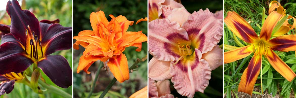 La floraison des hémérocalles est variée, tant dans les formes que dans les couleurs ! Hemerocallis ‘Jungle Beauty’ (photo F.D. Richards), Hemerocallis fulva ‘Flore Pleno’, Hemerocallis ‘Siloam Merle Kent’ (photo F.D. Richards) et Hemerocallis ‘Tigereye Spider’ (photo James Steakley)