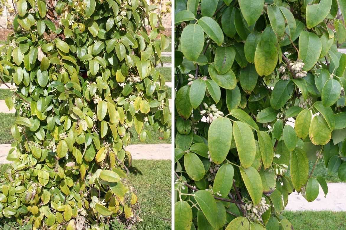 Son feuillage persistant est vert foncé et coriace. La feuille, longue de 7 à 15 cm, est dite imparipennée, c’est-à-dire constituée en réalité de plusieurs folioles elliptiques et indépendantes, en nombre impair (dont une foliole terminale), insérées de part et d’autre du pétiole. Le nombre de folioles peut varier de 3 à 9 et leurs bords sont entiers.
