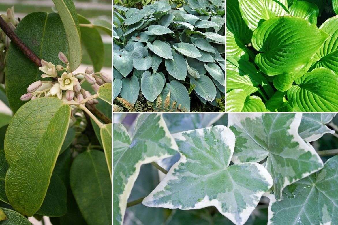 Un exemple d’association à mi-ombre : Holboellia coriacea et lierre panaché sur la façade d’un bâtiment et un jeu d’Hostas de teintes différentes dans une plate-bande à leur pied. Pourquoi ne pas ajouter aussi quelques fougères au joli feuillage découpé ou des géraniums vivaces ?