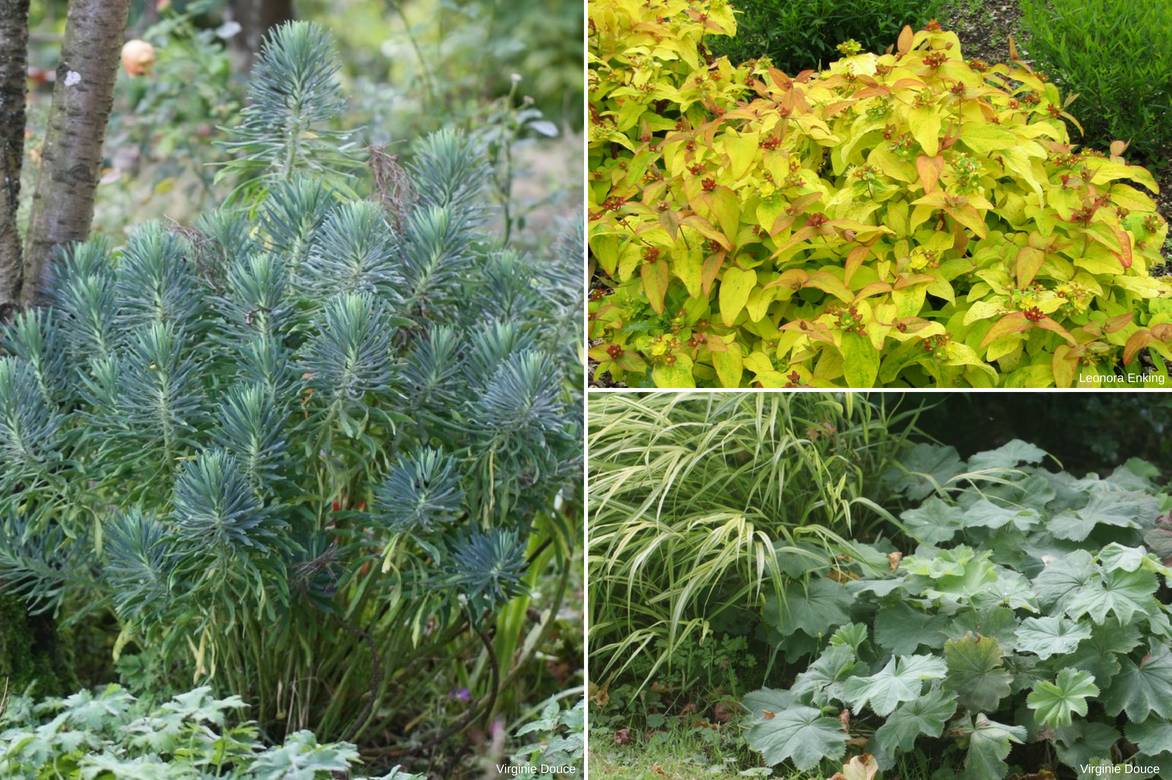 Une idée d’association : Hypericum ‘Golden Beacon’, Euphorbia characias ssp. wulfenii, Hakonechloa macra ‘Aureola’ et Alchemilla mollis