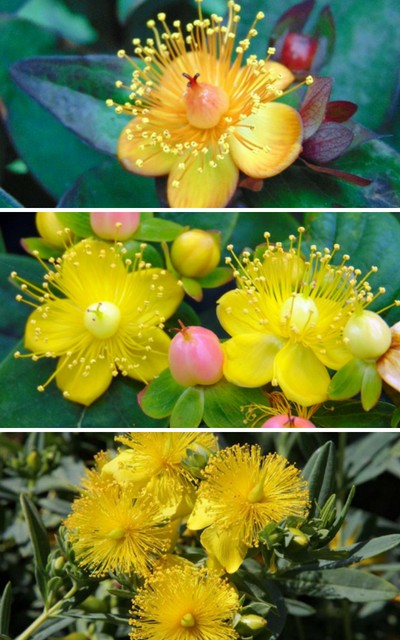 Les millepertuis possèdent un feuillage très décoratif : Hypericum moserianum ‘Tricolor’, Hypericum inodorum ‘Rheingold’, Hypericum ‘Golden Beacon’