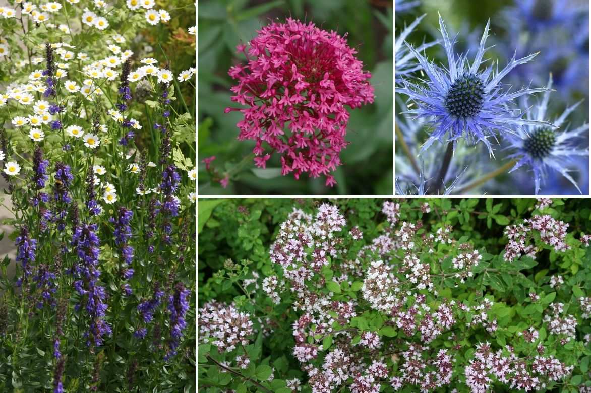 Un exemple d’association en massif naturel en terre sèche : Hysope et camomille dorée (ou non), valériane des jardins, panicaut et origan