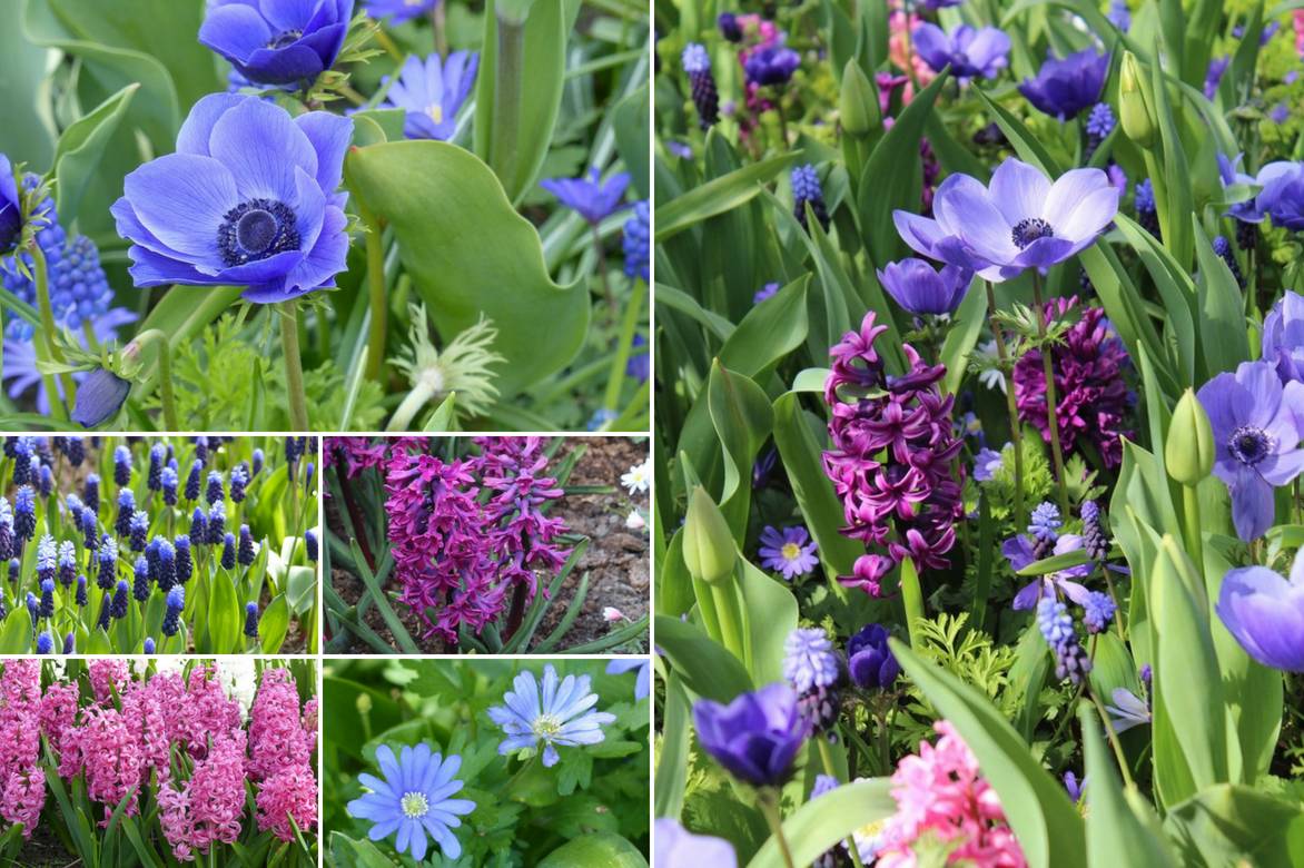 Un exemple d’association : Anemone coronarius, Muscari latifolium, Hyacinthus ‘Woodstock’, Hyacinthus ‘Pink Pearl’, Anemone blanda ‘Blue Shades’.