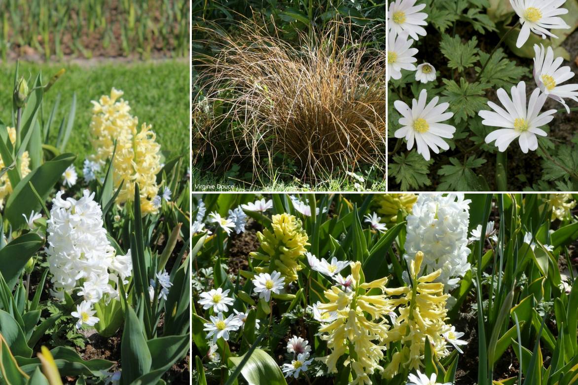 Un exemple d’association : Jacinthe jaune comme ‘City of Harleem’, Jacinthe blanche comme ‘Madame Sophie’, Anemone blanda ‘White Splendour’ mêlés à quelques touffes de Carex buchananii.