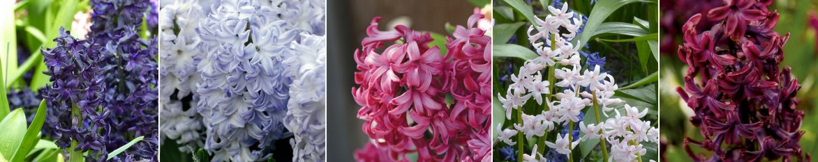 Plusieurs formes et coloris : Hyacinthus ‘Dark Dimension’, Hyacinthus ‘Blue Eyes’, Hyacinthus ‘Jan Bos’, Hyacinthus multiflore rose, Hyacinthus ‘Woodstock’.