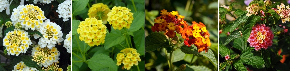 Fleurs de Lantana de plusieurs couleurs : Lantana camara ‘Lucky White’, Lantana camara ‘Chapel Hill Yellow’, Lantana camara ‘Lucky Red Flame’ et Lantana camara ‘Lucky Rose Sunrise’.