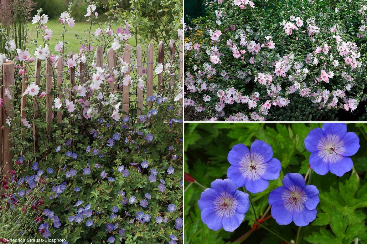 Un exemple d’association romantique : Lavatera ‘Barnsley’, Geranium ‘Rozanne’