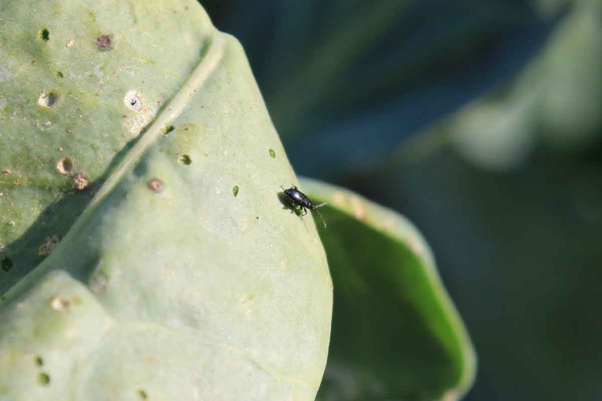 Altise sur feuille de chou – Provoque des dégâts importants sur les feuilles de radis – Photo :  A. Gourmelen