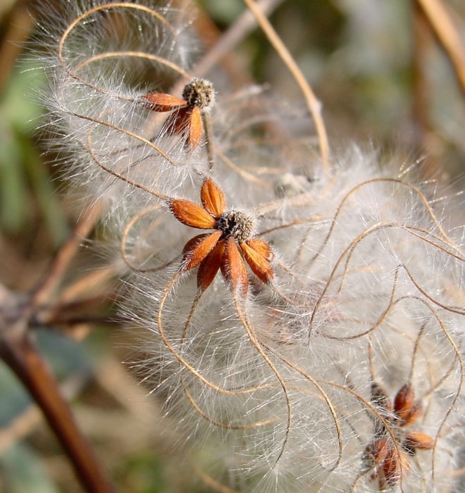 La clématite porte des fruits décoratifs très caractéristiques. Ce sont des akènes prolongés par un long style plumeux, ce qui leur confère une extrême légèreté.