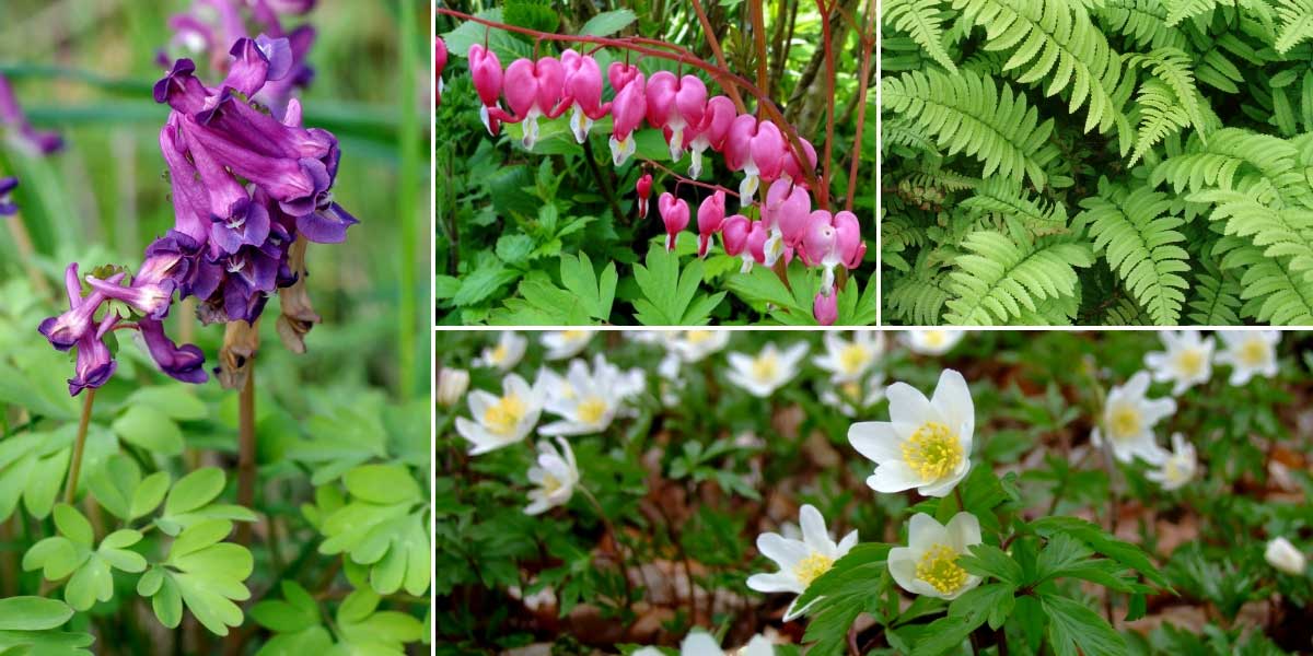Les corydales peuvent s’intégrer à un jardin de sous-bois, avec des feuillages décoratifs et floraisons lumineuses, pour un style très naturel. Corydalis solida (photo Christian Fischer), Dicentra spectabilis, Dryopteris cycadina et Anemone nemorosa (photo Pandano)