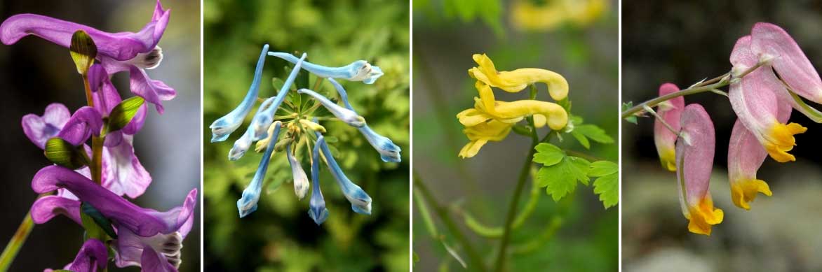 La floraison des corydales. Corydalis cava (photo Michael Apel), Corydalis flexuosa ‘Blue Panda’ (photo David J. Stang), Corydalis pallida var. tenuis et Corydalis sempervirens (photo Jason Hollinger)