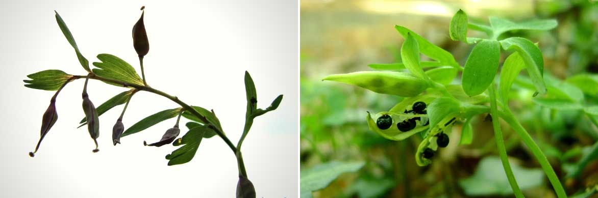 Les capsules de Corydalis solida (photo Bff), et celles de Corydalis intermedia, renfermant des graines noires (photo Kenraiz, Krzysztof Ziarnek)
