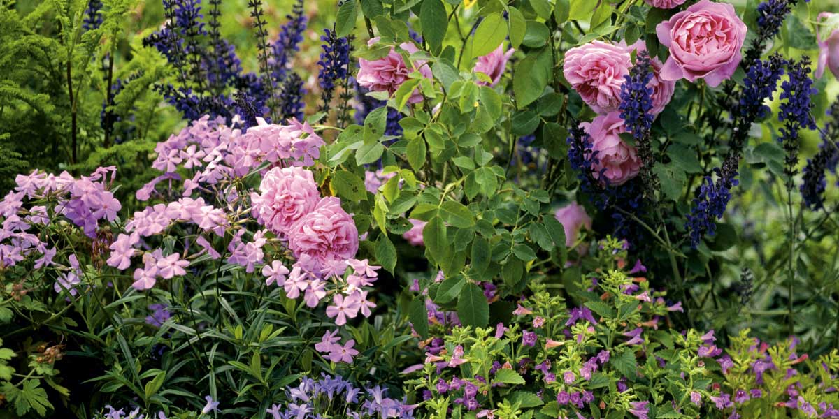 Une idée d’association : Rosier ‘Gertrude Jekyll’, Calamintha grandiflora, Salvia nemorosa et Phlox cardina ‘Bill Baker’ (photo Friedrich Strauss – MAP)