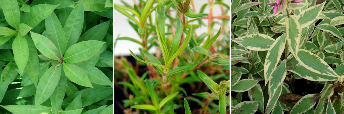 Le feuillage des phlox : Phlox paniculata ‘Bright Eyes’, Phlox subulata ‘Scarlet Flame’ et Phlox paniculata ‘Becky Towe’