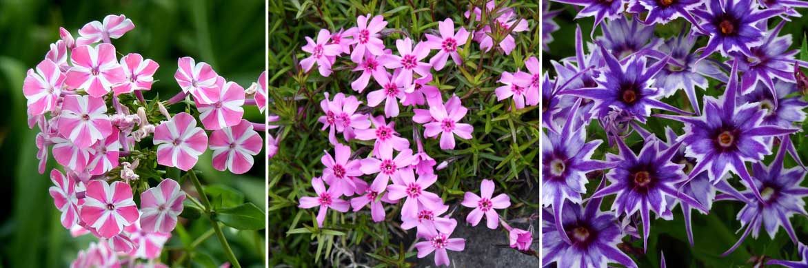 La floraison des phlox : Phlox paniculata ‘Peppermint Twist’, Phlox subulata (photo Anneli Salo), et Phlox drummondii ‘Popstars F1 Blue’