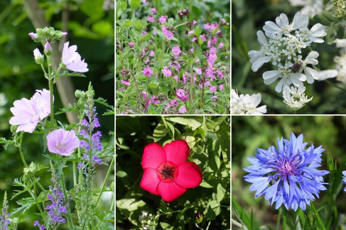 Une autre idée d’association : Malva moschata et Linaria purpurea, Silene dioica, Orlaya grandiflora, Linum grandiflorum ‘Rubrum’ et Centaurea cyanus